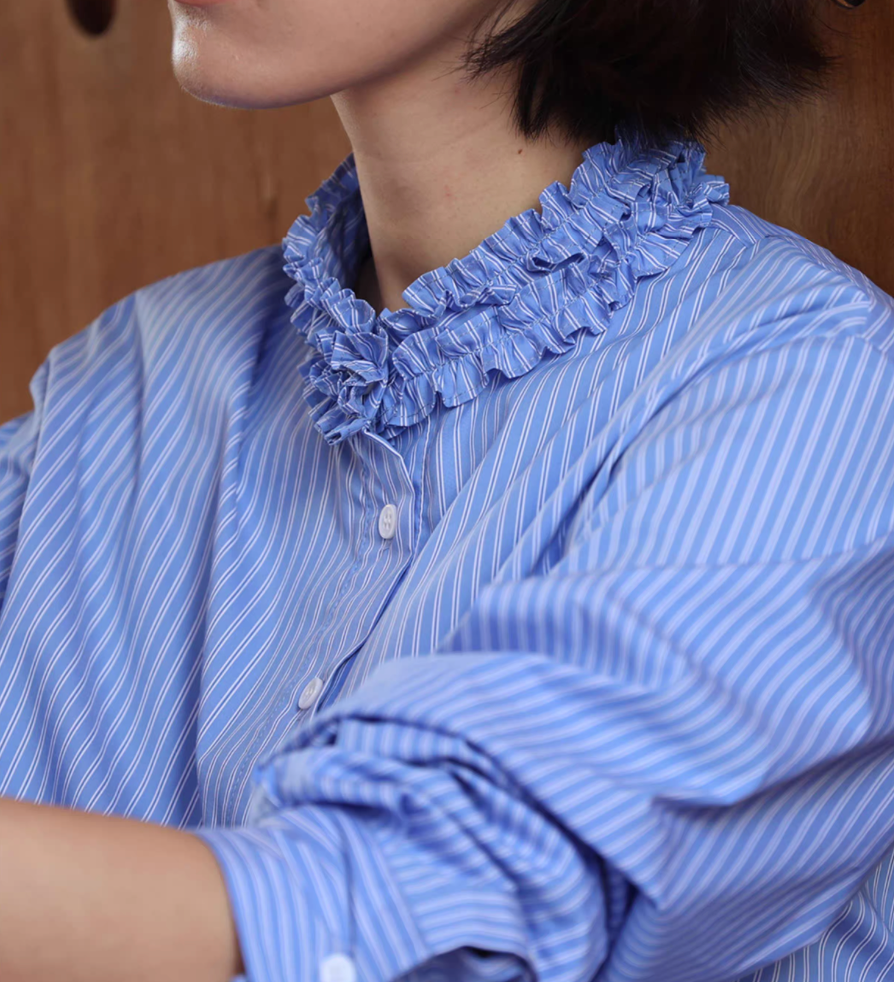 Ruffled collar buttoned blue striped cotton blouse / shirt